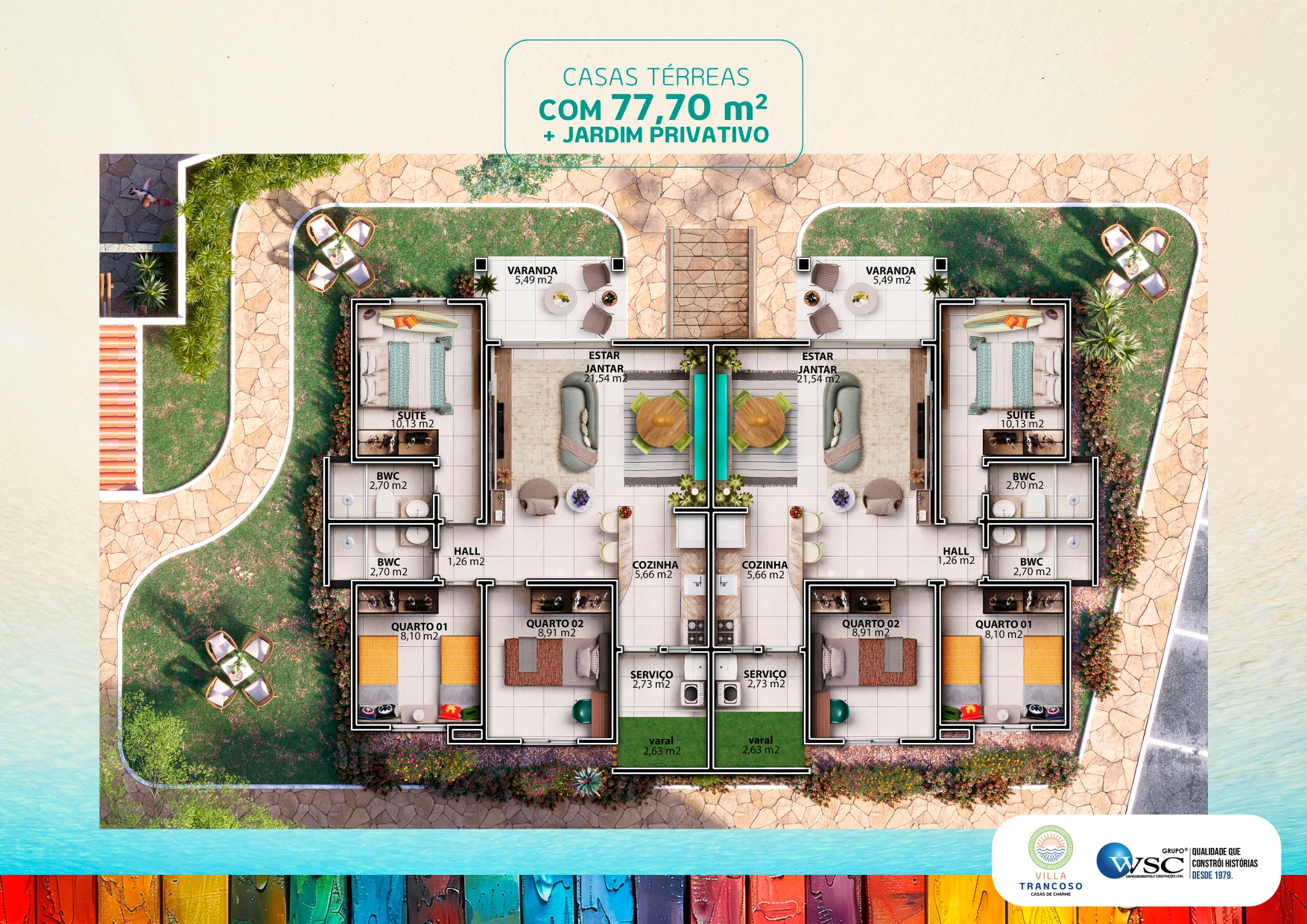 - Casas térreas com 77,70 m² + jardim privativo, com 2 vagas privativas de garagem;